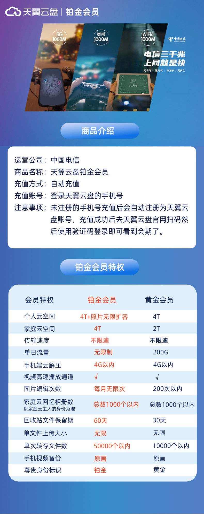 【账号直充】天翼云盘铂金VIP会员『3个月』接口直充丨立即到账丨24小时全天秒单!